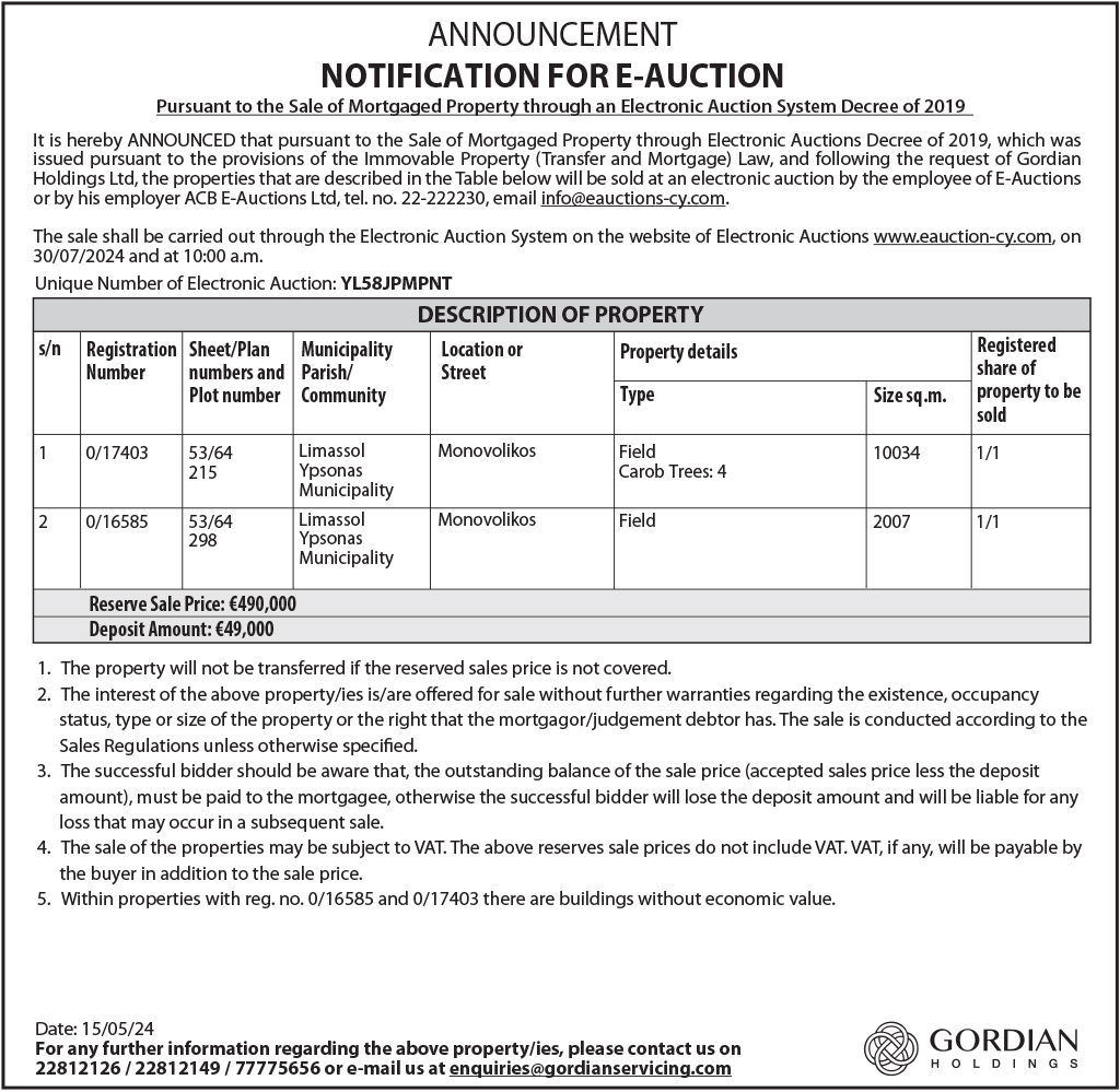 המגרש ימכר דרך מכרז. את ההצעה יש להגיש דרך סוכן מורשה בקפריסין.